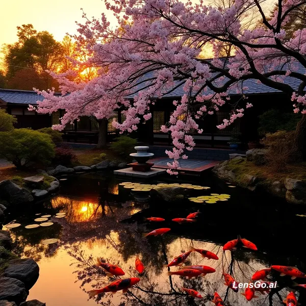 AI Image: A serene Japanese garden at golden hour, koi pond reflecting cherry blossoms