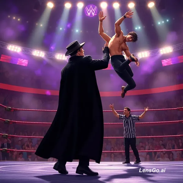 Anime cinematic wrestling arena packed with a cheering crowd, dramatic spotlights and smoke effects. A dark mysterious wrestler inspired by Undertaker slowly walks to the ring wearing a long black coat and hat, supernatural purple aura surrounding him. Another energetic wrestler inspired by Shawn Michaels enters with bright lights, confident swagger and athletic movements. The referee stands in the ring ready for the match.The bell rings and the fight begins with fast anime-style wrestling choreography: running clotheslines, flips, dramatic dodges, power slams, and high-speed anime motion lines. Camera angles shift like a Japanese anime battle scene, showing intense expressions and impact effects when moves land.The dark wrestler uses supernatural energy and powerful choke slams while the athletic wrestler counters with high-flying kicks and top-rope attacks. The crowd roars as the battle becomes more intense with slow-motion impact frames and glowing energy effects like a shonen anime fight.Final moment: the dark wrestler lifts his opponent for a dramatic finishing move, slamming him into the ring with a massive shockwave and anime impact lines. The referee counts one, two, three as the crowd erupts and the victor stands in the ring with dramatic lighting and cinematic anime style.