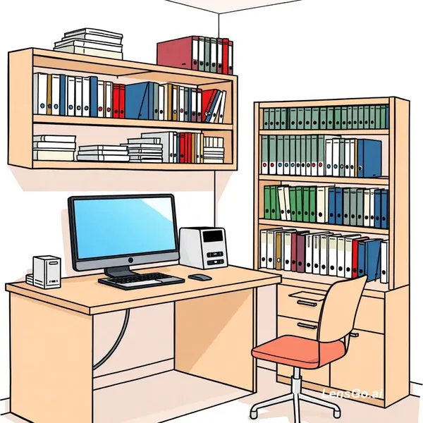 please fill the room with a laptop and a computer screen on the desk, and fill the shelves with books and folders. Please try to keep the same drawing style