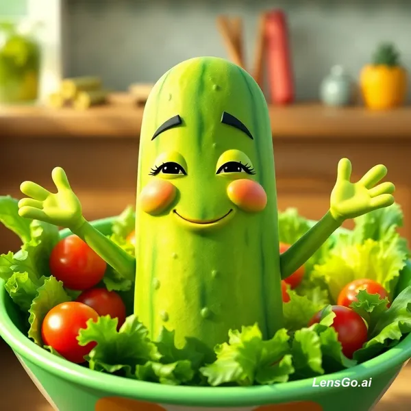 Pixar-style 3D render of a fresh green cucumber character. Facial Features: • Eyes: relaxed almond-shaped eyes • Eyebrows: soft and peaceful • Mouth: gentle smile Arms & Gesture: • Arms open calmly as if cooling the air Scene: Inside a colorful salad bowl with lettuce and tomatoes, fresh kitchen lighting, crisp and refreshing Pixar-style atmospherePixar-style 3D render of a fresh green cucumber character. Facial Features: • Eyes: relaxed almond-shaped eyes • Eyebrows: soft and peaceful • Mouth: gentle smile Arms & Gesture: • Arms open calmly as if cooling the air Scene: Inside a colorful salad bowl with lettuce and tomatoes, fresh kitchen lighting, crisp and refreshing Pixar-style atmosphere