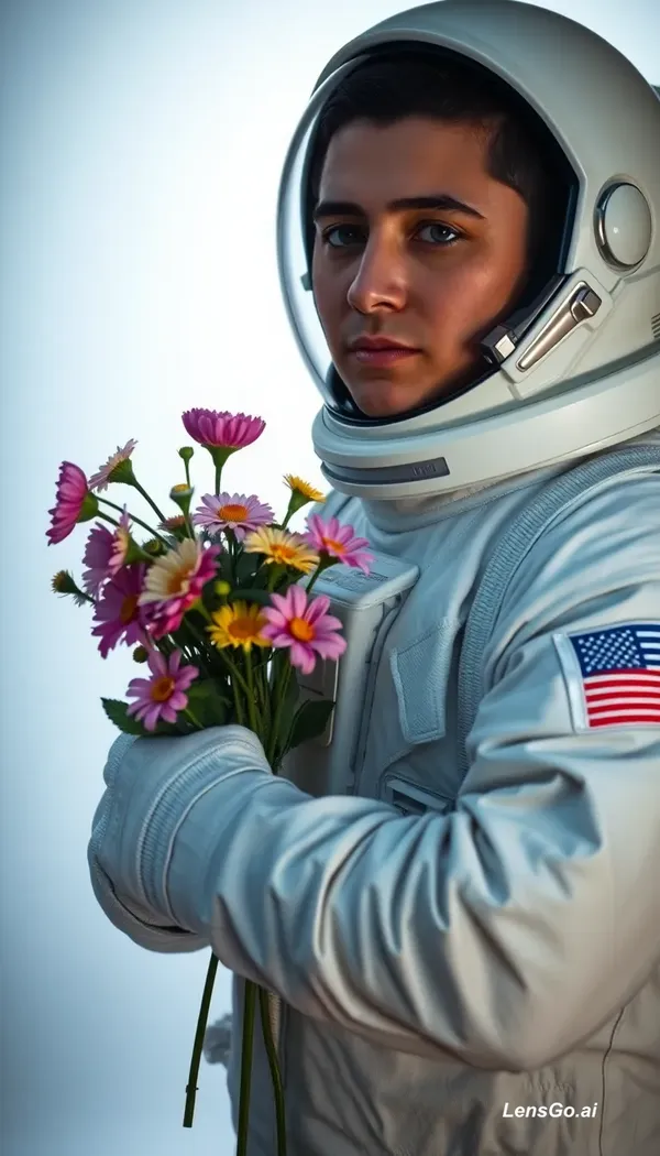 AI Image: Studio portrait of an astronaut holding flowers, dramatic lighting