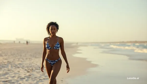 AI Image: generate a 15 seconds video of an african female model ramp walking in swimwear on the beach, shot o