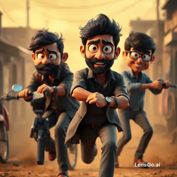 AI Image: 3D animated Indian comedy gangster movie, cinematic lighting, dramatic shadows, expressive cartoon c
