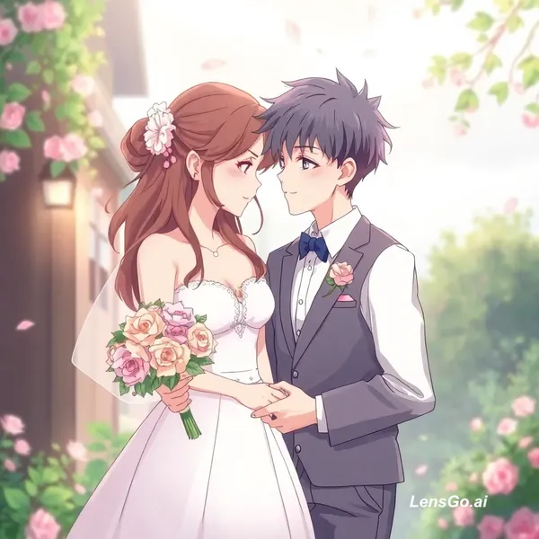 Romantic anime love story. A girl and a boy meet again after several years. The boy sends flowers and takes care of her. One day he takes her away and they start a new life together. They move to the city and live together while she studies and he works. The girl receives her diploma and he proudly congratulates her. In August they have a beautiful wedding. Now they are a happy couple dreaming about their future and their own home. Soft romantic anime style.
