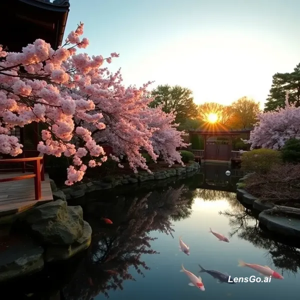 AI Image: A serene Japanese garden at golden hour, koi pond reflecting cherry blossoms