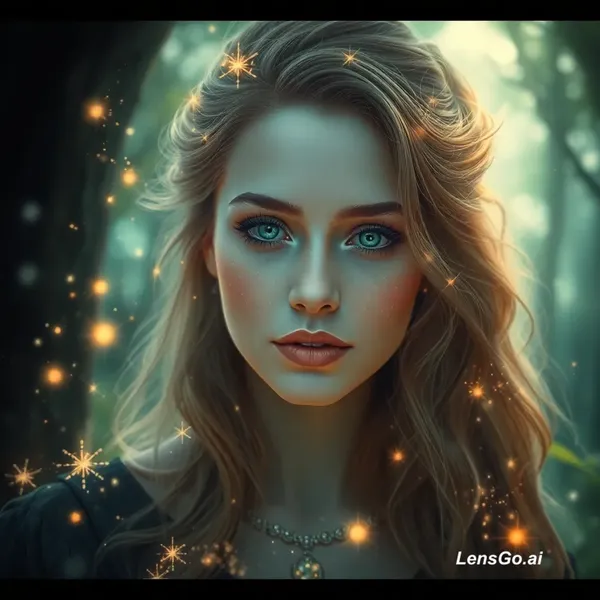 AI Image: Ethereal fantasy portrait with magical glowing particles, enchanted forest background, soft dreamy l