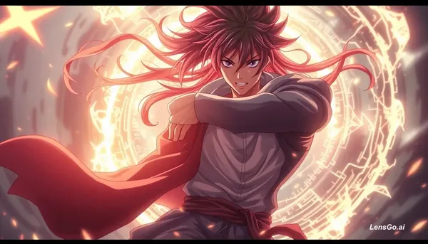 AI Image: anime cinematic transformation, dynamic wind blowing, intense glowing aura around character, dramati