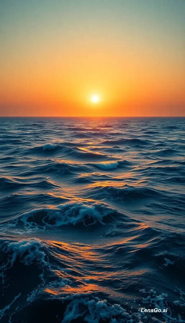 AI Image: Cinematic wide shot of a vast, deep blue ocean under a golden sunset, huge waves crashing but the ho