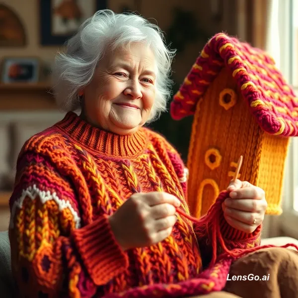 AI Image: Hyper-realistic photo of a grandmother knitting a giant sweater that turns into a cozy house. The co