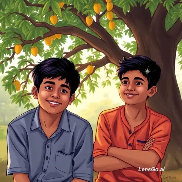 Arjun and Sameer had been best friends since childhood. They grew up in a small town, where dusty roads, mango orchards, and the old banyan tree near the river were part of their everyday lives. That banyan tree was special. It was where they first met-two shy boys on their first day of school, both hiding from a strict teacher. Sameer had shared his lunch with Arjun, and Arjun had shared his umbrella during a sudden rainstorm. From that day on, they were inseparable. Years passed, and their bond only grew stronger. Arjun was the dreamer-he loved reading books, imagining big cities, and talking about building something meaningful in life. Sameer, on the other hand, was practical and grounded. He helped his father run a small shop and believed in steady, simple living. Despite their differences, they balanced each other perfectly. One evening, sitting under the banyan tree, Arjun said, "Sameer, one day I'm going to leave this town. I want to study in a big city and do something big." Sameer smiled, but there was a hint of sadness in his eyes. "And forget me?" he joked. "Never," Arjun replied firmly. "No matter where I go, we'll always be friends. Promise?" Sameer extended his hand. "Promise." They shook hands, sealing something deeper than words.