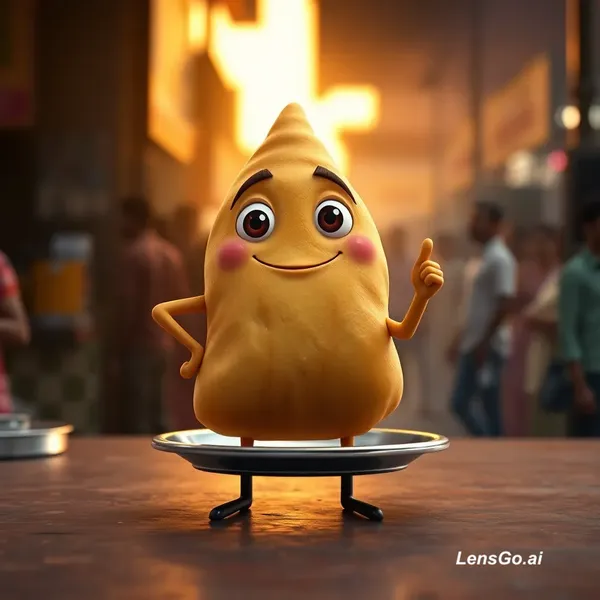 AI Image: Pixar-style 3D render of a golden, crispy samosa standing upright on a small steel plate. Eyes: warm