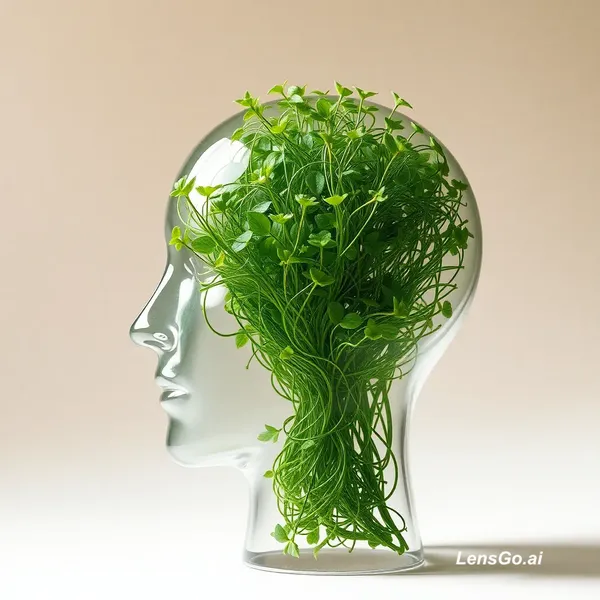AI Image: transparent glass human head filled with growing green plants and tiny circuits intertwined, symboli