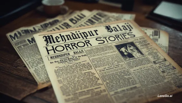 AI Image: create a video of news papers cuttings of horror stories of mehndipur balaji horror stories. I want