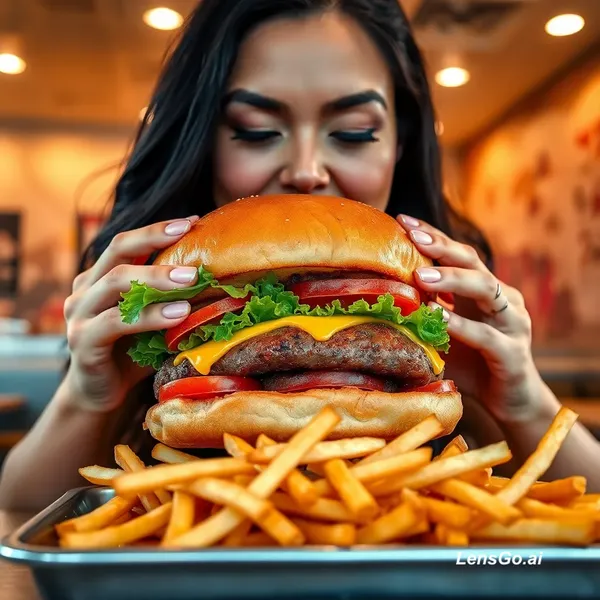 A close-up food photography scene of a woman in a restaurant trying to take a huge bite from an oversized giant burger with both hands. The burger is extremely large with a toasted bun, lettuce, tomatoes, cheese, and a thick patty overflowing. A tray full of thin French fries is placed on the table in front. The background shows a modern fast-food restaurant interior with warm lighting and wall patterns. The woman has long dark hair, makeup, and is looking at the burger while biting it. POV social media food video style, cinematic lighting, shallow depth of field, high detail, realistic, 4K. Short Prompt (for AI generators): Woman eating giant oversized burger, holding huge burger with both hands, tray full of french fries, fast food restaurant background, POV social media style, cinematic lighting, shallow depth of field, realistic food photography, 4K.