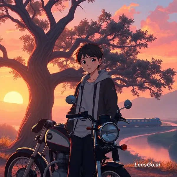 “Anime-style cinematic illustration of a teenage boy standing beside a classic motorcycle under a large twisted tree at sunset. The camera angle is from the front, capturing his calm and thoughtful expression as he looks slightly toward the horizon. His posture is relaxed, one hand in pocket or lightly resting on the bike, not sitting. A glowing orange, pink, and purple sunset fills the sky, with soft clouds and distant mountains in the background. A long train moves peacefully across the horizon beside a winding river reflecting the warm sky colors. The boy’s outfit is automatically styled with modern fashion (casual streetwear, layered jacket or hoodie), with colors adapting naturally to the sunset tones. Soft cinematic lighting highlights his face, hair, and the bike, with gentle shadows and depth of field. Highly detailed anime art, emotional and peaceful atmosphere, ultra-realistic textures, 4K quality, inspired by Makoto Shinkai style
