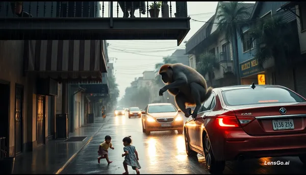 Dramatic action-emotion mix, rainy street below balcony, small girl falls in road, speeding car approaches, Mantu leaps from balcony in slow motion, runs desperately, pushes girl away with body, car hits him instead, impact in slow-mo, monkey rolls injured, blood on fur, girl safe but shocked, intense cinematic camera shake to steady, high drama, emotional heroism, 10 seconds.