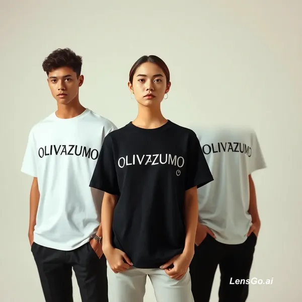 An advert for a luxury perfume brand, minimalist fashion editorial photoshoot, 2 models wearing t-shirt with bold "OLIVAZUMO" typography, Use Image of font attached clean style, one Asiatic female with boring face in the middle of the studio, pastel toned background with smooth gradient, soft shadows and high-end studio lighting, inspired by Balenciaga + Fear of God campaigns, fashion editorial lookbook aesthetic, ultra sharp focus, Canon EF 50mm F/1.4, 8k, shot for Vogue magazine, contemporary streetwear campaign.
