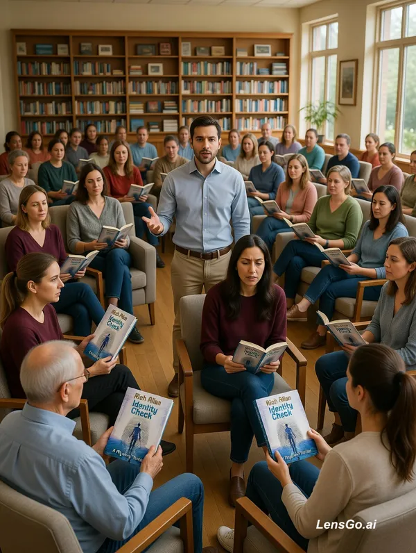 A large gathering of approximately sixty people in a spacious community room for an organized book discussion. In the center, a man between thirty and thirty-five years old leads the group, gesturing while speaking. Among the diverse crowd of seated participants, a distinct woman listens attentively. The members hold copies of a book, some engaged in quiet conversation while others look toward the organizer. The setting is filled with warm, natural light, with rows of bookshelves and comfortable chairs creating an inviting atmosphere for literary dialogue. The book has been attached
