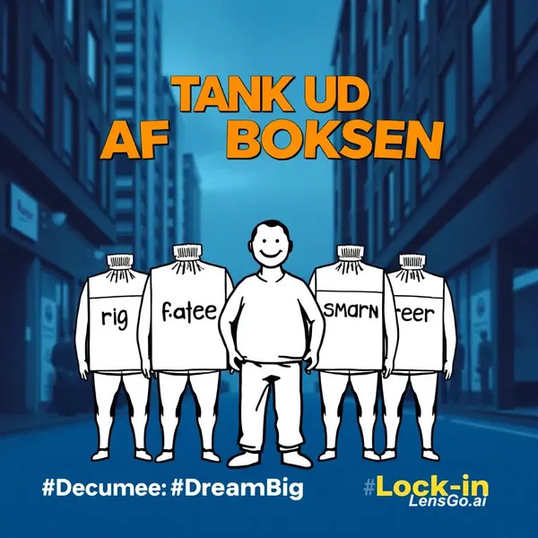 En moderne, humoristisk propagandaplakat i stil med en social media kampagne. En tegnet figur står i midten og er omgivet af overdrevne kasser med stereotype labels som "rig", "fattig", "doven", "smart", men figuren skubber kasserne væk og smiler. Baggrunden er farverig og energisk med et moderne bymiljø og digitale elementer. Stilen er flad, grafisk og ligner en Instagram-kampagne eller awareness-plakat. Stor tekst øverst: "TÆNK UD AF BOKSEN " "Ud af boksen" skal stå med orange. Nederst to hashtag: #DreamBig #Lock in. Humorous, modern, clean design, high contrast colors.