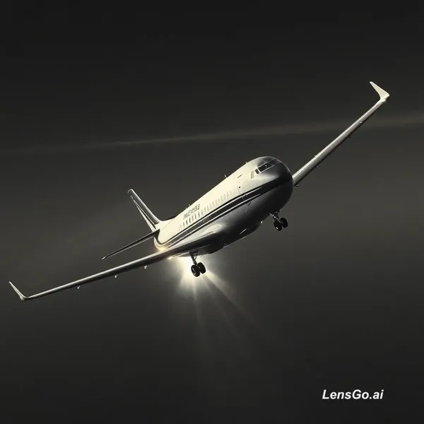 AI Image: Travelling avant rapide mais fluide vers Spotty. Avion décolle en arrière-plan avec léger flou dynam