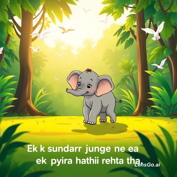 Visual Prompt: Cute baby elephant walking in green jungle, birds flying, bright morning sunlight, colorful cartoon style, kids animation Voiceover: “Ek sundar jungle me Chotu naam ka ek pyara hathi rehta tha.”