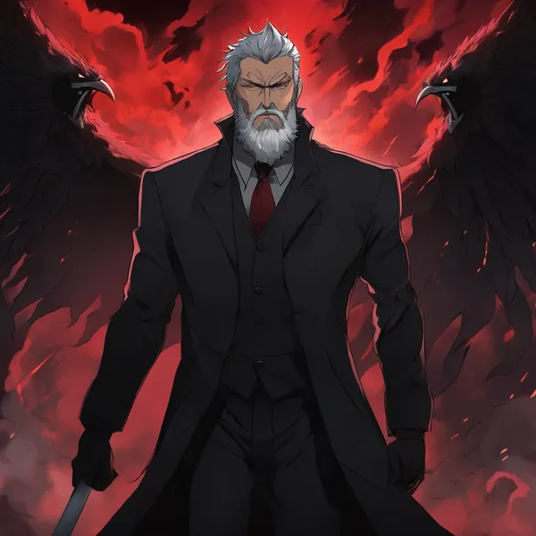 "Dark fantasy anime style, Berserk art style, heavy shadows. An older intense man with gray hair and a beard, wearing a dark suit. He has glowing red eyes. Background is a dark void with smoke. Scary atmosphere, villainous aura, highly detailed."