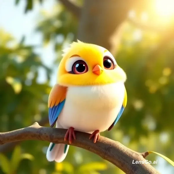 AI Image: 3D cartoon style, cute little colorful bird (chidiya) sitting on a green tree branch, big shiny eyes