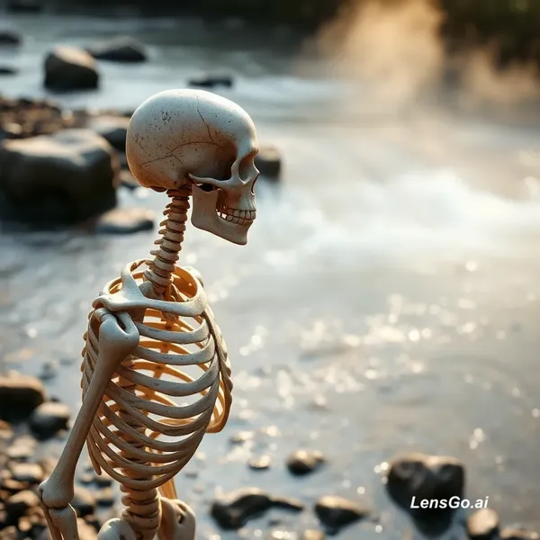 AI Image: Camera pan left to right, skeleton looking around near river, water flowing slowly, light wind movin