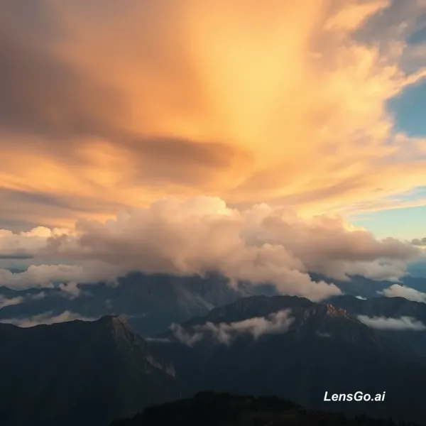 AI Image: Dramatic timelapse of clouds rolling over mountain peaks, golden hour to blue hour transition, epic