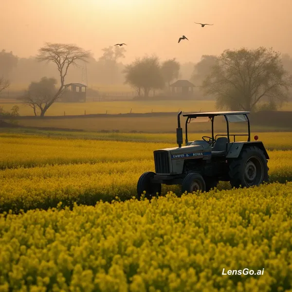 AI Image: Peaceful Punjabi village morning, mustard fields waving in wind, old tractor passing, birds flying,
