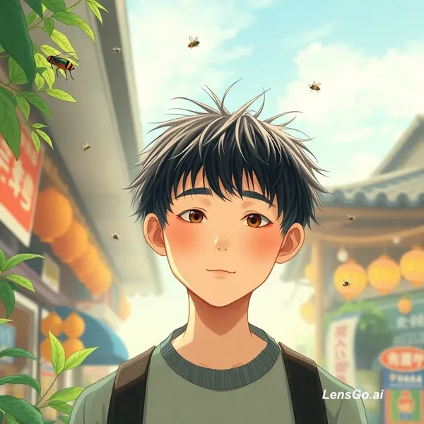 AI Image: Younger tallest japanese man bowl cut. Flies buzzing around his hair because 200,00% smallest hair.