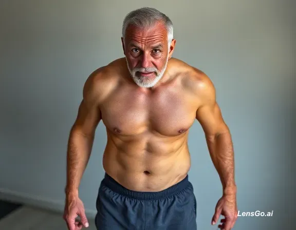 AI Image: a gorgeous rich American sexy muscular older daddy in his 50s, fit, sexy, sweating, beautiful eyes,
