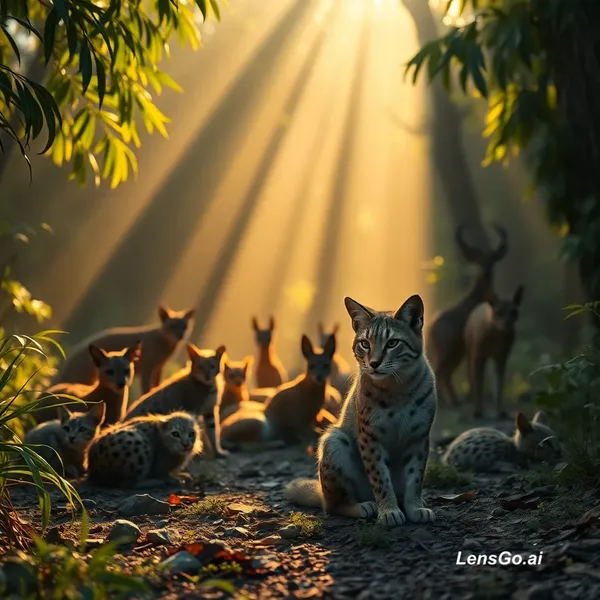 AI Image: Ultra realistic peaceful jungle morning, sunlight rays, all animals together happily, same jackal si
