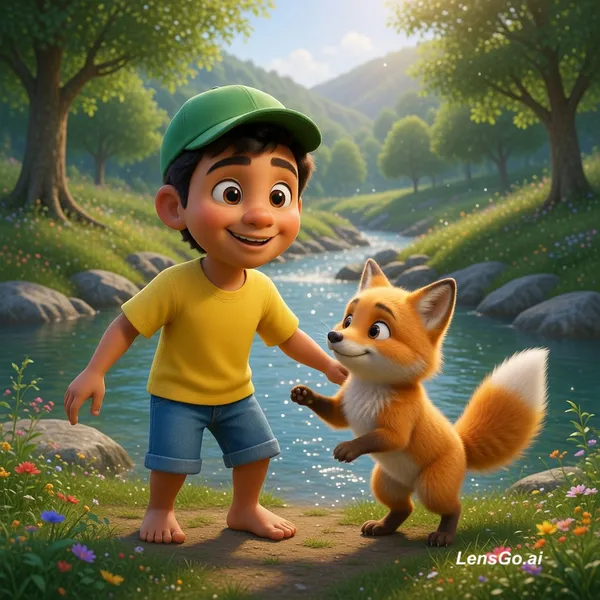 A high-quality 3D cartoon style illustration of a young Somali boy named Hirsi playing with his fox best friend near a clear flowing river. Hirsi has warm brown skin, big expressive eyes, short black hair, wearing a green cap, yellow t-shirt and blue shorts, barefoot and smiling happily. The fox is small, fluffy, bright orange with white chest and tail tip, playful and friendly. They are in a beautiful green landscape with trees, flowers, rocks, and soft sunlight. Background includes rolling hills.