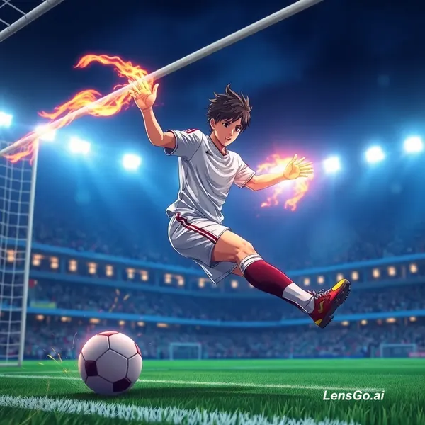 AI Image: An anime soccer player scoring a goal from midfield, ball glowing with fire, stadium lights shining,