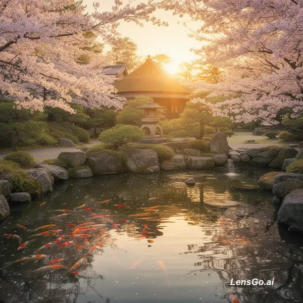 AI Image: A serene Japanese garden at golden hour, koi pond reflecting cherry blossoms
