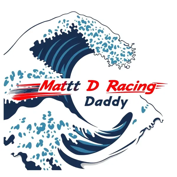 This concept directly replaces a racing element with the wave itself, creating a powerful metaphor for mastering the chaos of the track. Icon/Symbol: The central image is the curling, claw-like crest of the Great Wave. However, instead of being a simple wave, it's stylized to represent one of two things: Tire Smoke: The wave is drawn to look like a massive plume of stylized tire smoke billowing from a car that is drifting through a corner. The "fingers" of the foam are exaggerated to show aggressive motion. The Racetrack Corner: The curve of the wave is the shape of the perfect racing line through a sharp corner or chicane. The cresting top is the "apex" of the turn. Typography: "MattDaddy Racing" is typeset in a font that has a mix of sharp angles and brush-stroke feel (an angular brush font). The text is placed strategically, either appearing to be the source of the "smoke wave" or perfectly navigating the "wave corner." Color Palette: Directly inspired by the woodblock print. Primary: Deep Prussian Blue and a lighter cerulean blue for the wave. Foam/Highlights: Off-white or cream for the "claws" of the foam. Accent/Text: A bold, powerful Red (like a Japanese hanko stamp or a racing brake caliper) for the text, providing a striking contrast.