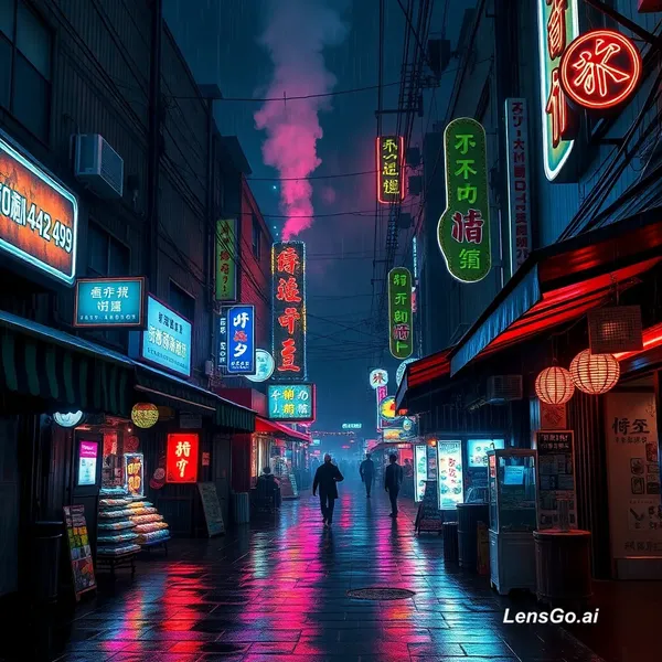 AI Image: Cyberpunk street market in the rain, neon signs and steam rising
