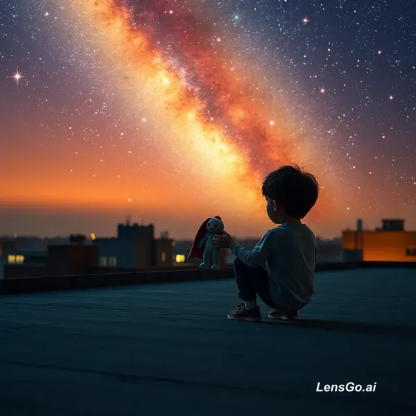 "A lonely boy sitting on a rooftop at sunset, holding a broken toy. Suddenly the sky transforms into a galaxy, stars swirling around him, and the toy magically repairs itself. Emotional, cinematic lighting, slow motion, ultra-realistic, 4K, dramatic music build."