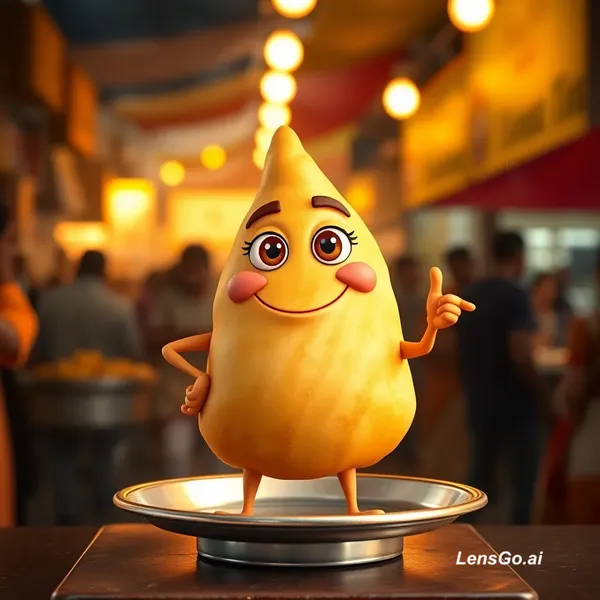 Pixar-style 3D render of a golden, crispy samosa standing upright on a small steel plate. Eyes: warm, expressive almond-shaped eyes with a confident sparkle Eyebrows: slightly arched in pride Mouth: cheeky half-smile with a tiny smirk of spice Arms: one hand on hip, the other pointing dramatically like it’s making a bold statement Legs: tiny sturdy legs planted firmly Scene: Bustling Indian street food stall at sunset, warm orange glow, steam rising in slow motion, blurred crowd in the backgroun