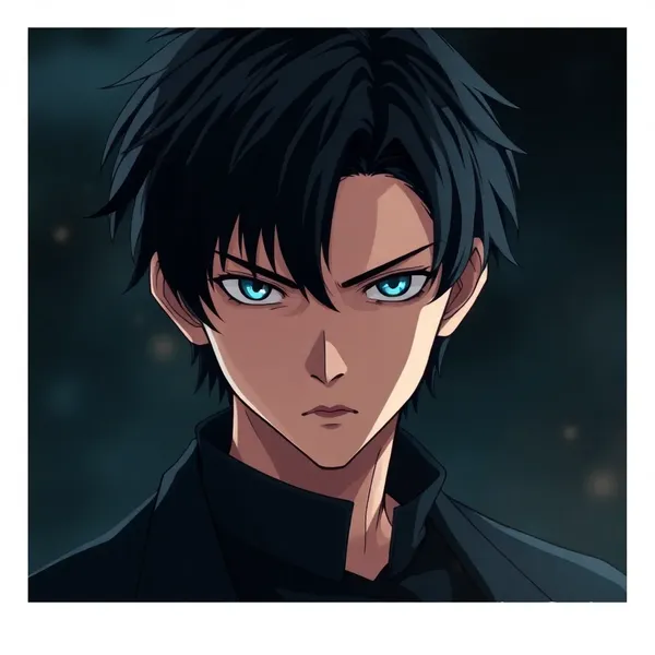 AI Image: anime boy, black hair, serious face, wearing dark outfit, cinematic, higt detail, dramatic lighting