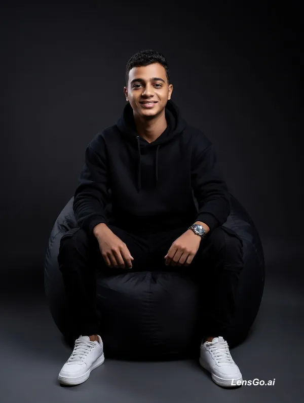 A cinematic portrait of a man (use the uploaded picture as reference for the face) sitting confidently on a round black beanbag chair against a dark gradient background. He wears a black hoodie with the sleeves slightly pushed up, black cargo pants, and clean white sneakers. A silver wristwatch is visible on his left wrist. His pose is relaxed and strong elbows resting on his knees, hands hanging loosely between his legs. He has a calm, slight smiling facial expression. The lighting is dramatic and directional, illuminating his face, sneakers, and upper body while the background fades into darkness. The atmosphere is modern, minimalist, and powerful, with a studio photography style and high contrast.