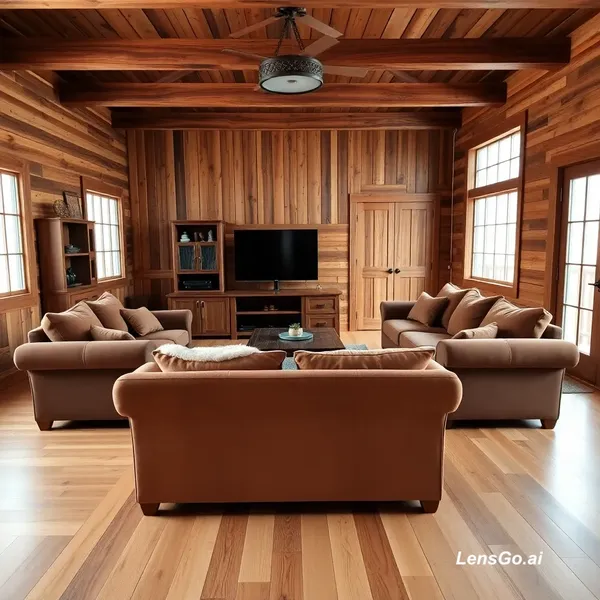 RECLAIMED WOOD FARMHOUSE LIVING ROOM WITH ENTERTAINMENT CENTER WITH CABINETS, WIDE SCREEN TV , 2 Rustic Brown Buckskin Sofa. WOOD PLANK WALLS FLOOR AND CEILING WITH BEAMS. FARMHOUSE STYLE NOT MODERN. NO FIREPLACE. FORWARD FACING THE VIEWER BACK WALL, CENTERED, W/FRONT DOUBLE DOORS WITH BENCH COAT RACK. RIGHT SIDE WALL ON THE RIGHT SIDE WALL LARGE WINDOW. SOFA IN FRONT OF WINDOW 5FT AWAY FROM WINDOW 5 FT FROM WINDOW WALKING PATH BETWEEN SOFA AND WINDOW. IS ONE SOFA. FACING LARGE SCREEN TV/ ENTERTAINMENT CENTER 2ND SOFA SHOULD BE L-SHAPED FROM 1ST SOFA AND FACING DIRECTLY CENTERED DIRECTLY CENTERED TO THE FRONT DOUBLE DOORS. SOFAS ARE L-SHAPED NO CHAIRS. FOLLOW DIRECTIONS EXACTLY. HEAD ON VIEW