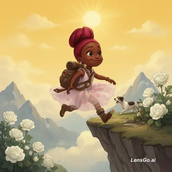 Create a cartoon using this character. The character should be a carefree traveler stepping off a cliff. Include white roses a small dog and a knapsack. Include other elements such as the sun, white roses, mountain peeks and a yellow sky in the background. The style of artwork should resemble Grimm fairy tale imagery. The characters skin should be a medium brown African American color.