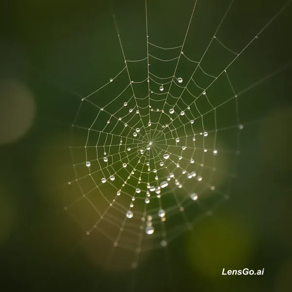 AI Image: Macro photograph of morning dew on spider web, bokeh background