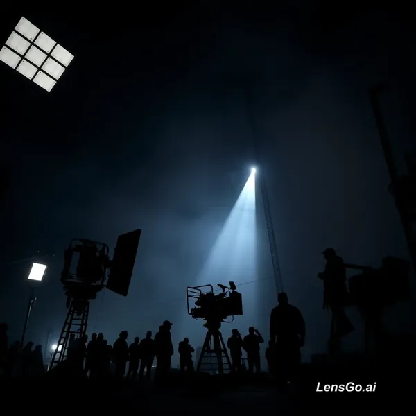 Behind the scenes of a major motion picture production. Silhouettes of crew members working among massive lighting rigs and cranes against a dark night sky. Beams of light cutting through thick haze. Industrial and cinematic atmosphere, dark color palette with sharp highlights, minimalist composition, wide angle.