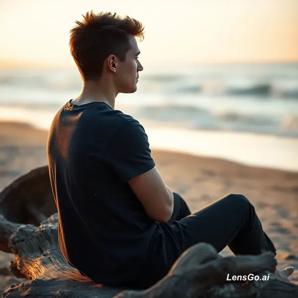 A highly detailed, photorealistic portrait , sitting on the beach from the exact same rear three-quarter profile perspective. He is in the same pose, leaning against the weathered driftwood log in the foreground with his knees bent and arms folded across his chest. He gazes off to the right towards the ocean. His short, spiky brown hair has the same texture. The photorealism is impeccable, with visible skin pores and hair strands. He wears the same dark, paint-splattered t-shirt and dark trousers. The warm, golden hour sunlight backlights him, creating rim lighting and the same atmosphere. The blurred beach, waves, and horizon remain consistent in the background. The log in the foreground is rendered with intricate detail.