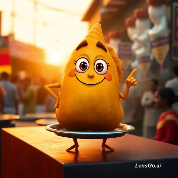Pixar-style 3D render of a golden, crispy samosa standing upright on a small steel plate. Eyes: warm, expressive almond-shaped eyes with a confident sparkle Eyebrows: slightly arched in pride Mouth: cheeky half-smile with a tiny smirk of spice Arms: one hand on hip, the other pointing dramatically like it’s making a bold statement Legs: tiny sturdy legs planted firmly Scene: Bustling Indian street food stall at sunset, warm orange glow, steam rising in slow motion, blurred crowd in the backgroun