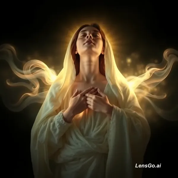 Madonna right before Christ’s birth, in ecstasy, levitating slightly, hands crossed over her heart, sheer white mantle with just a hint of flesh tone under a white shift, swirling luminous lights enlightening her closed eyes and upturned face, chiaroscuro technique