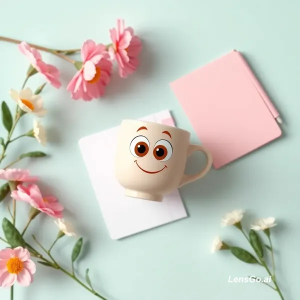AI Image: Aesthetic flat lay composition for Instagram, pastel colors, coffee cup, notebook, flowers, minimali